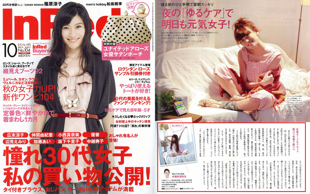 『InRed』10月号、【夜の「ゆるケア」で明日も元気女子!】にて、衣理クリニック表参道院長 片桐衣理が肩などのコリと睡眠について、改善方法や快眠のコツなどコメントさせて頂きました。「コリレベルCHECKシート」の監修もしております。是非、ご覧下さいませ。