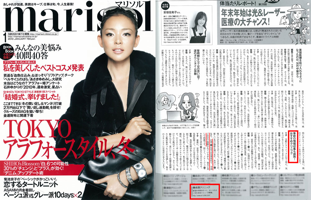 『 marisol 』1月号「年末年始は光&レーザー医療の大チャンス!」にて、美容エディターの安倍佐和子さんがおすすめするクリニックに衣理クリニック表参道が紹介されました。